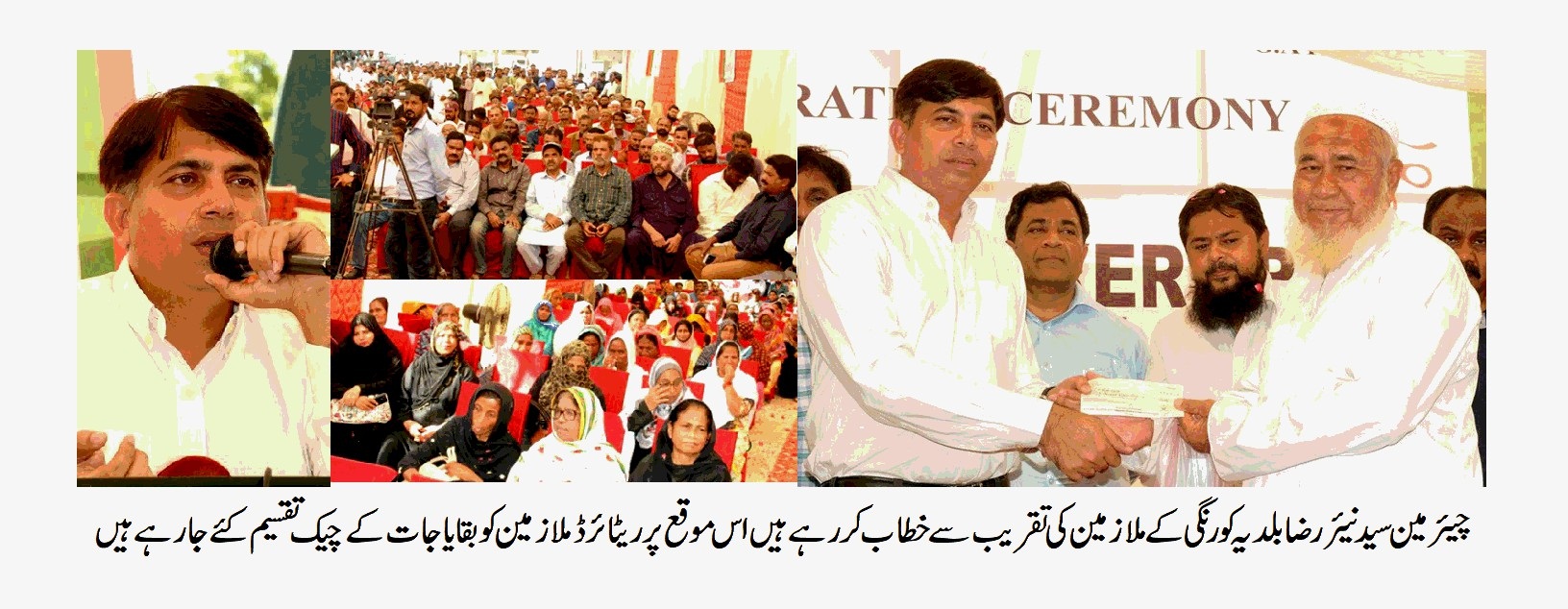چیئر مین بلدیہ کورنگی سید نیئر رضا نے ملازمین سے خطاب کرتے ہوئے کہاکہ ملازمین ادارے کے لئے ریڑھ کی ہڈی کی حیثیت رکھتے ہیں انہوںنے ملازمین ادارے پر بوجھ نہیں بلکہ بازو بنیں اپنے فرائض نیک نیتی کے ساتھ احسن طریقے سے انجام دیں سید نیئر رضا نے کہاکہ گورنمنٹ آف سندھ کی جانب سے گزشتہ کئی سالوں سے فراہم کی جانے والے OZTفنڈز میں اضافہ نہیں کیا گیا جبکہ ملازمین کی تنخواہوں میں ہر سال اضافہ کیا جاتا ہے اضافی فنڈز کی عدم فراہمی کی وجہ سے بلدیہ کورنگی شدید مالی بحران کا شکار رہی مگر ہم اپنے ملازمین کی تنخواہوں کی ادائیگی کو بروقت یقینی بنا رہے ہیں انہوں نے کہاکہ بلدیہ کورنگی مالی بحران کے باوجود اپنے ریٹائرڈ ملازمین کو بقایا جات کی آدائیگی یقینی بنا نے کی ہر ممکن کوشش کررہی ہے چیئر مین بلدیہ کورنگی سید نیئر رضا نے کہاکہ ہم ان تمام چیلنجز سے نبرد آذما ہوکر علاقائی ترقی اور عوام کو بلدیاتی سہولیات کی فراہمی کے ساتھ ادارے کے ملازمین کی فلاح و بہبود اور ملازمین کے مسائل کو ترجیح بنیادوں پر حل کر رہے ہیں۔