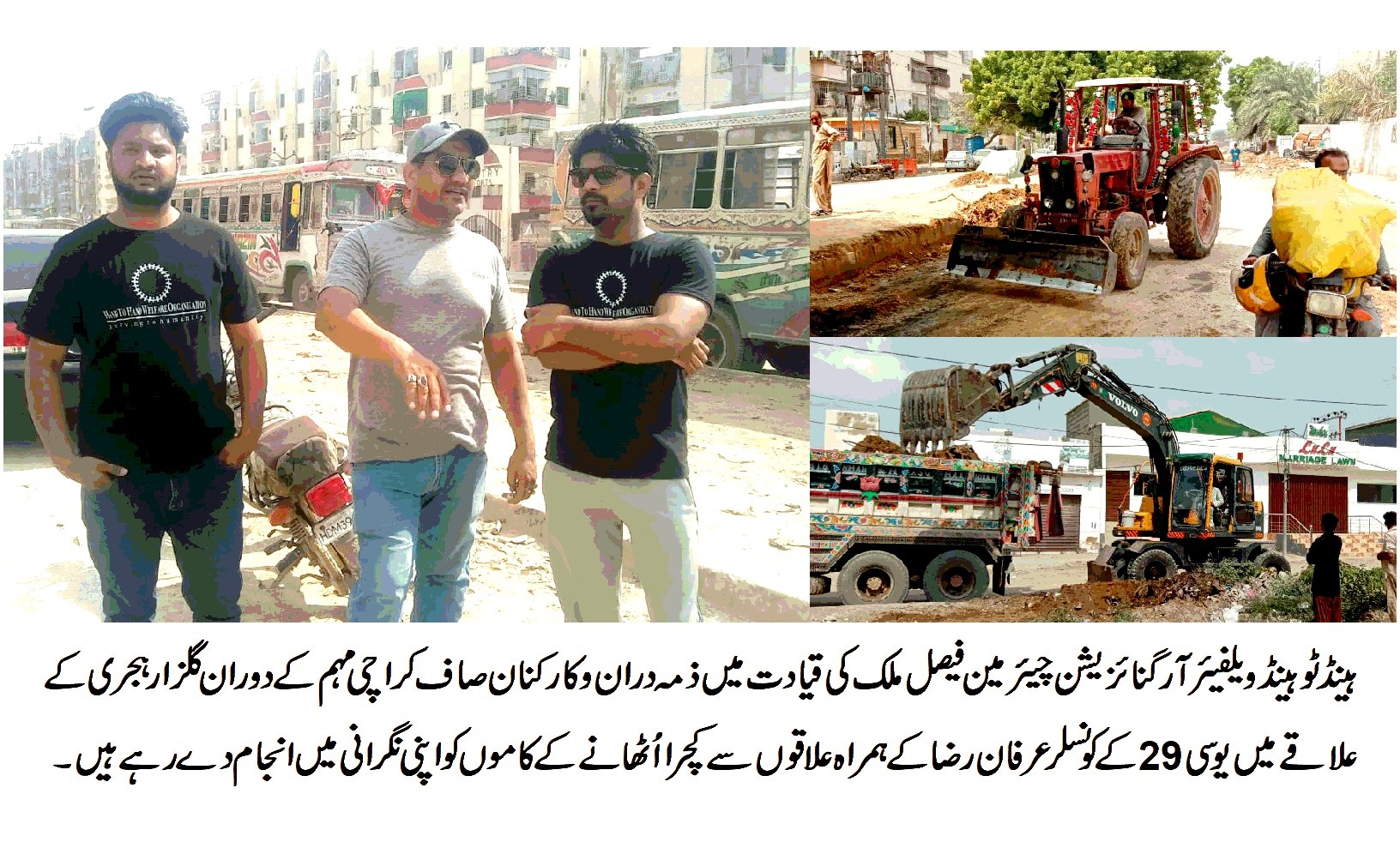 چیئرمین فیصل ملک کا یونین کمیٹی 29کے چیئر مین علی کوثر ،وائس چیئر مین زمین فاطمہ اور کونسلر عرفان رضا کے ہمراہ مائی کلین کراچی مہم کے حوالے سے گلزار ہجری اور ملحقہ علاقوں میں جاری کچرا اُٹھا نے کے کاموں کی نگرانی کی اس موقع پر چیئر مین فیصل ملک نے کہاکہ شہر کراچی کو کچرے سے پاک بنا نے کے لئے شہر میں رہنے والے ہر فرد کو اپنا کردار ادا کرنا ہوگا ہینڈ ٹو ہینڈ ویلفیئر آرگنائزیشن صاف ستھرے صحت مند ماحول کے قیام اور معاشرے میں سدھار لانے کے لئے کردار ادا کرتی رہے گی۔