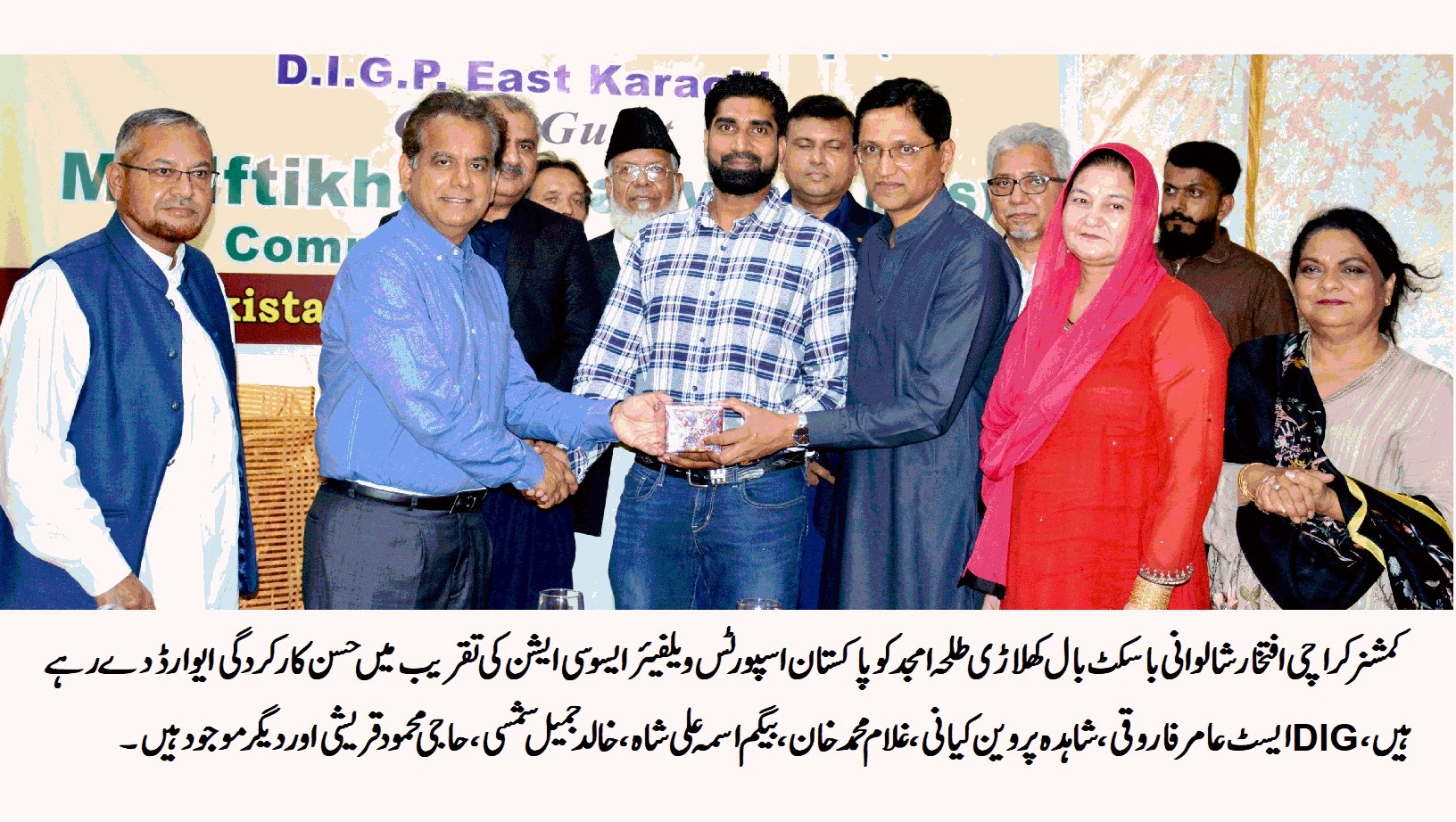 انہوں نے کہا کہ انشا اللہ پاک سری لنکا کر کٹ سریز کے بعد مختلف کھیلوں کے مقابلے منعقد کئے جائینگے اور 6اکتوبر کو 33ویں نیشنل گیمز کی ٹارچ ریلی کی تقریب شاندار انداز میں منعقد کی جائیگی انہوں نے ایوارڈ حاصل کرنے والی شخصیات کو مبارکاب دی اور اس توقع کا اظہار کیا کہ وہ کھیلوں کی مزید بہتر انداز میں خدمت کرینگے اس موقع پر عامر احمد فاروقی نے کہاکہ موجود آئی جی سندھ کلیم امام جو کہ کھیلوںسے محبت کرنے والی شخصیت ہیں اُن کی ہدایت پر 3اکتوبر سے IGPسندھ انٹر ڈسٹرکٹ ہاکی لیگ کا آغاز ہورہا ہے اور انشا اللہ دیگر کھیلوں کے مقابلے بھی محکمہ پولیس منعقد کرائے گا ۔قبل ازیں تقریب کے میزبان غلام محمد خان نے پاکستان اسپورٹس ویلفیئر ایسوسی ایشن کی سالانہ رپورٹ اور ایوارڈ کی تفصیلات پیش کی تقریب سے خالد جمیل شمسی ، شاہدہ پروین کیانی، بیگم اسمہ علی شاہ ،احمد علی راجپوت ،انجینئر سید محفوظ الحق ،آصف عظیم،حاجی محمود قریشی نے خطاب اور نظامت کے فرائض عظمت اللہ خان نے انجام دیئیاس موقع پر کمشنر کراچی افتخار شالوانی نے باسکٹ بال کے کھلاڑی طلحہ امجد کو سالانہ گولڈ میڈل جبکہ فٹ بال آرگنائزر سلیم خمیسانی ،شوٹنگ بال آرگنائزر اعجاز احمد قریشی ،یوگا آرگنائزر خالد بروہی ،ایتھلیٹ آرگنائزر اورنگزیب سلطان ،جوڈو آرگنائزر محمد رفیق ،کرکٹ آرگنائزر جمیل احمد ،ہاکی آرگنائزر عارف صدیقی ،باسکٹ بال آرگنازئر طارق حسین ،گرلز باسکٹ بال آرگنائزر زعیمہ خاتون ،ٹینس آرگنائزر سرور حسین ،ڈنکی کارٹ ریس آرگنائزر نذر بلوچ ،سائیکل ریس آرگنائزر ملک کلیم اعوان کے علاوہ بلدیہ کورنگی کے ڈپٹی ڈائریکٹر انفارمیشن محمد ارشد کو کھیلوں کے فروغ میں خدمات پر خصوصی ایوارڈ سے نوازا۔