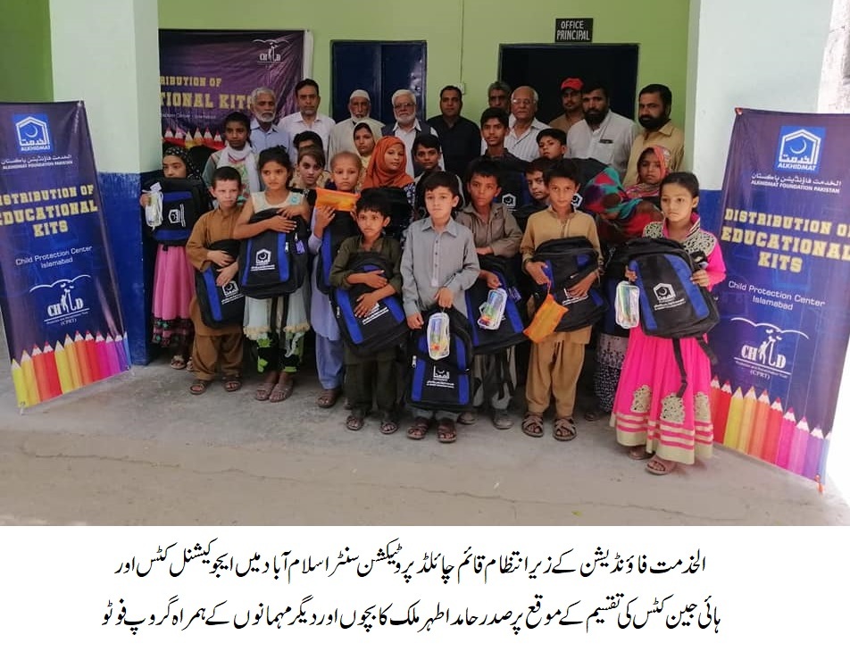 الخدمت فاؤنڈیشن کے زیر انتظام چائلڈ پروٹیکشن سنٹر اسلام آباد کے بچوں میں ایجوکیشنل کٹس اور ہائی جین کٹس تقسیم کی گئیں
