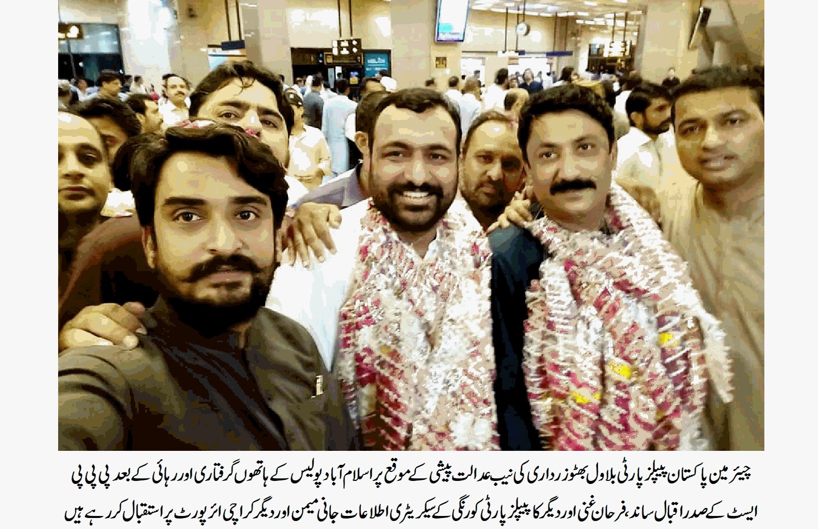 ان خیالات کا اظہار انہوںنے نیب عدالت کے باہر سے گرفتاری اور رہائی کے بعد ڈسٹرکٹ ایسٹ کے صدر اقبال ساند ،فرحان غنی اور دیگر رہنمائوں کی کراچی ائر پورٹ پر کارکنان کی جانب سے پرتباک استقبال کے موقع پر کیا جانی میمن نے مزید کہا کہ ریاستی مشینری کے استعمال اور آمرانہ ہتھکنڈوں کے ذریعے پیپلزپارٹی کے کارکنوں کو نہ ڈرایا جاسکتا ہے اور نہ دھمکایا جاسکتا ہے اس موقع پر پیپلز پارٹی ایسٹ اور کورنگی کے کارکنان نے کراچی ائر پورٹ پر رہنمائوں کا شاندار استقبال کیا کراچی ائر پورٹ جئے بھٹو کے نعرے سے گونج اُٹھا۔