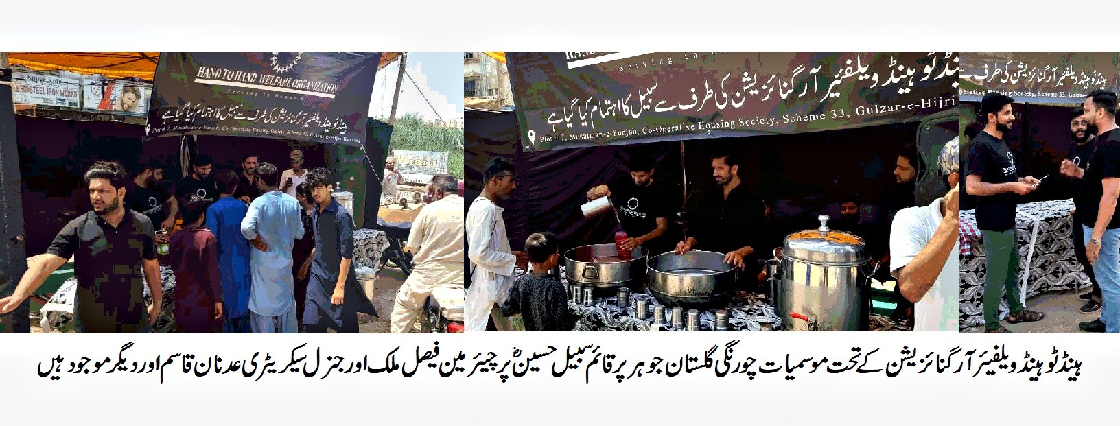 چیئر مین فیصل ملک نے بتا یا کہ ہینڈ ٹو ہینڈ ویلفیئر آرگنائزیشن عوامی خدمت اور معاشرے میں تبدیلی کے لئے عوامی کے باہمی تعاون سے اقدامات کو بروئے کار لارہی ہے انہوںنے کہا کہ محرم الحرام کی مناسبت سے موسمیات چورنگی پر سبیل حسین کا اہتمام کیا گیا جو کہ عاشورہ محرم تک قائم رہے گا۔