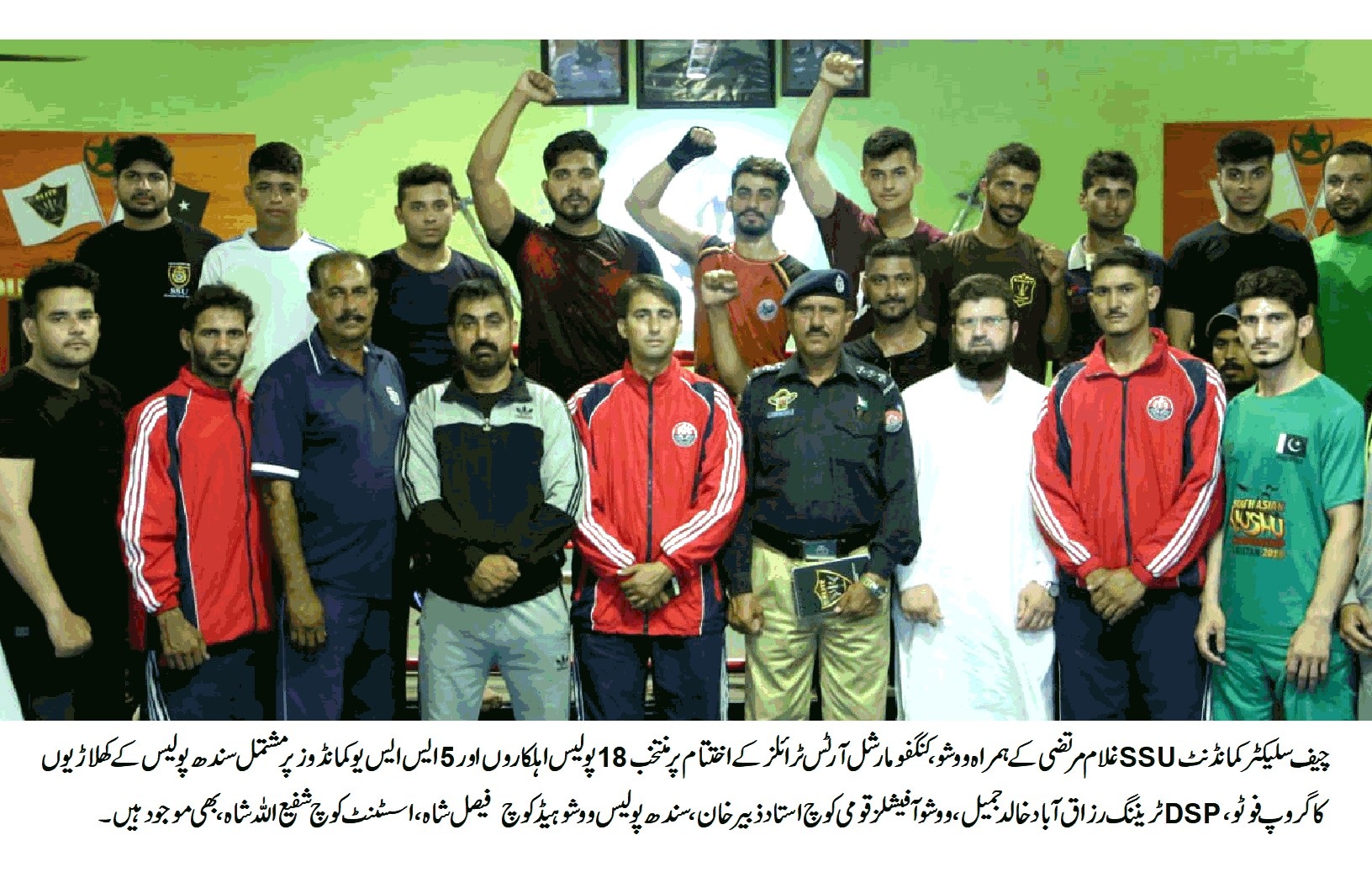 کھلاڑیوں کی صلاحیتوں کا مغور مشاہدے کے بعد چیف سلیکٹر کمانڈنٹ SSUغلام مرتضیٰ نے 18پولیس اہلکاروںاور5،SSUکمانڈوز کی سلیکشن کی جو کہ آئندہ ہونے والے ووشو ،کنگفو مارشل آرٹس مقابلوں میکں حصہ لیں گے چیف سلیکٹر غلام مرتضیٰ نے اُمیدظاہر کی ہے کہ منتخب کھلاڑی اپنی بہترین کارکردگی کے ذریعے سندھ پولیس کا نام روشن کرینگے۔