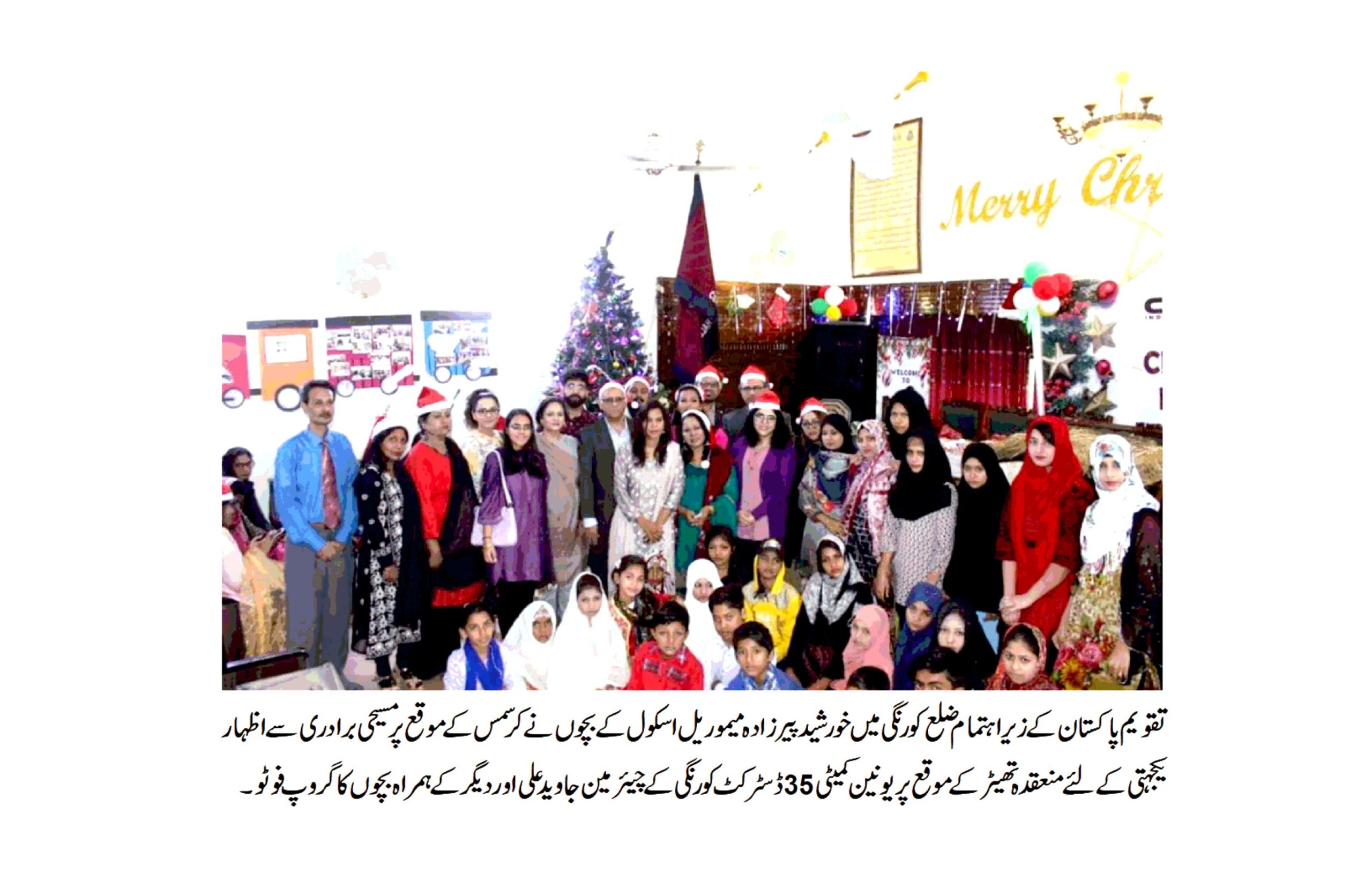 کراچی (اسٹاف رپورٹر) تقویم پاکستان کے زیر اہتمام خورشید پیزادہ میموریل اسکول کے اشتراک سے کرسمس کی پر وقار تقریب کا انعقاد ،اسکولوں کے طلباء وطالبات نے تقویم پاکستان کے ذمہ دران کے ہمراہ چرچ میں جاکر مسیحی عوام کو کرسمس کی مبارکباد پیش کی اس موقع پر مسیحی مذہبی رہنمائوں اور عوام کو گلدستہ اور کیک پیش کیا گیا اس موقع پر UC-35ڈسٹرکٹ کورنگی کے چیئر مین سید جاوید علی نے تقویم پاکستان کے نوجوانوں کے نیک جذبے کو سراہتے ہوئے کہا کہ وطن کی تعمیر و ترقی میں مسیحی عوام کے کردار کو کبھی فراموش نہیں کیا جا سکتا۔