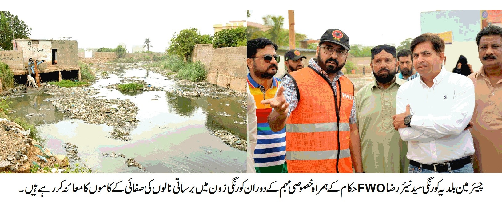 اس موقع پر انہوںنے FWOحکام کے تعائون سے ضلع کورنگی کی حدود میں جاری برساتی نالوں کی صفائی کے کاموں کا بھی معائنہ کیا اس موقع پر چیئر مین بلدیہ کورنگی سید نیئر رضا نے FWOحکام کو تکنیکی تفصیلات فراہم کیں،FWOحکام کی جانب سے نالوں کی صفائی کا کام زیرو پوائنٹ CBMنالے سے شروع کردیا گیا ہے ،چیئر مین بلدیہ کورنگی نے کہاکہ لانڈھی زون میں کچرا اُٹھانے کا کام شروع کردیا گیا بلدیہ کورنگی کی جانب سے FWOحکام کو مقامات کی نشاندہی کی جاچکی ہے،دوسرے مرحلے مٰں شاہ فیصل اور ملیر میں نالوں کی صفائی اور کچرے کے ڈھیروں کا خاتمے کا آغاز کیا جائیگا ،چیئر مین سید نیئر رضا نے کہاکہ ہم FWOحکام کی جانب سے خصوصی مہم کا انعقاد خوش آئندہ اقدام ہے انہوںنے کہاکہ بلدیہ کورنگی کی جانب سے سندھ حکومت سے کئی بار نالوں کی صفائی اور کچرا اُٹھا نے کے حوالے سے درخواست کی گئی لیکن حوکمت سندھ کی جانب سے کبھی بلدیہ کورنگی کو خاطر خواہ جواب نہیں دیا گیا سید نیئر رضا نے کہاکہ عوامی خدمت کے حوالے سے تعاون اور خصوصی گرانٹ تو کجا پچھلے کئی ماہ سے معمول کی OZTمیں بھی کٹوتیاں کی جارہی ہیں،بلدیہ کورنگی مالی مشکلات کے باوجود صفائی وستھرائی اور علاقائی ترقی اور عوامی خدمت کا فریضہ انجام دے رہی ہے چیئر مین بلدیہ کورنگی سیدنیئر رضا نے کہاکہ بلدیہ کورنگی میں صفائی و ستھرائی کے نظام میں حائل دشواری کچرا اٹھانے کی گاڑیوں می کمی ہے اگر بلدیہ کورنگی کو کچرا اُٹھانے کے لئے گاڑیاں فراہم کردی جائیں تو ،صفائی و ستھرائی کے اس مہم کو معمول کا حصہ بنا سکتے ہیں۔