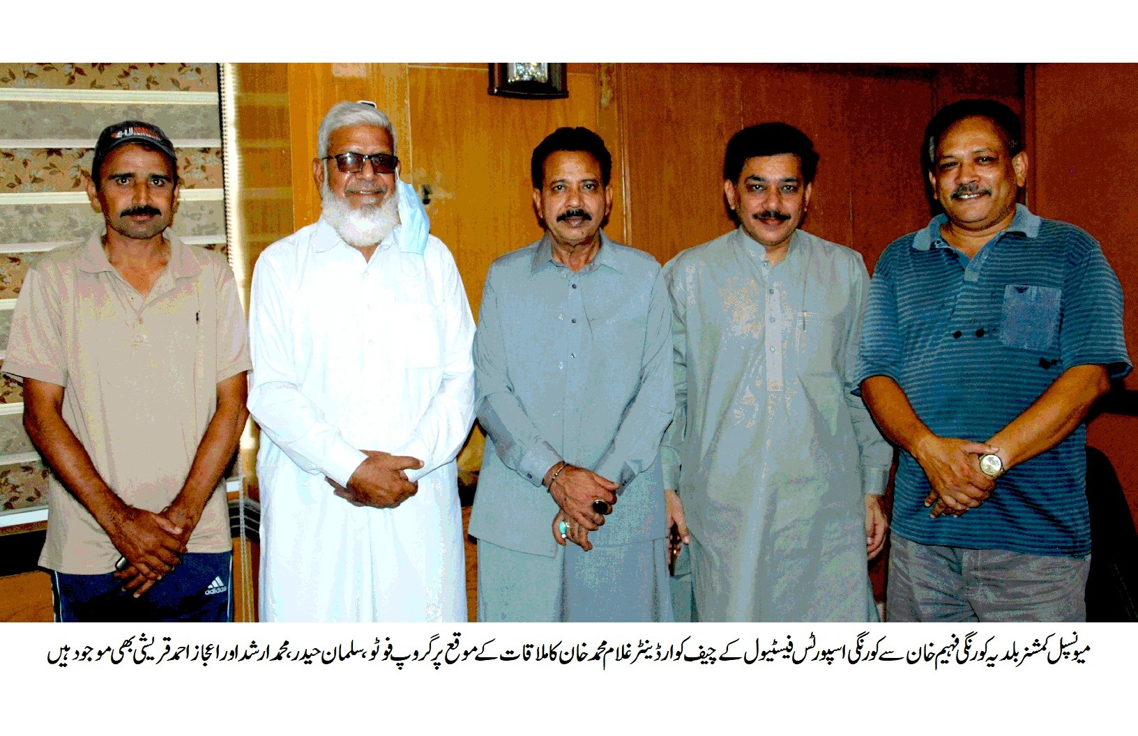 ان خیالات کا اظہار انہوں نے شاہ فیصل زون اپنے دفتر میں اہلیان کورنگی کے زیر اہتمام بلدیہ کورنگی و ضلعی انتظامیہ کورنگی کے اشتراک سے منعقد ہونے والے کورنگی اسپورٹس فیسٹیول 2020ء کے چیف کوارڈینٹر غلام محمد خان کی قیادت میں وفد سے ملاقات میں کیا وفد میں فیسٹیول چیئر مین میڈیا کمیٹی محمد ارشد ،PWDشوٹنگ بال ٹیم کے کپتان اعجاز احمد قریشی شامل تھے۔